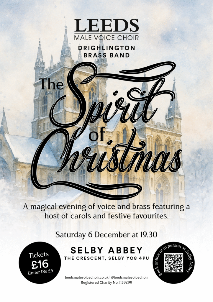 The choir return to Selby Abbey for Christmas following the sell out performance of 2024. Joined by Drighlington Brass Band for an evening of Christmas songs and carols, this is the perfect way to start your Christmas season.