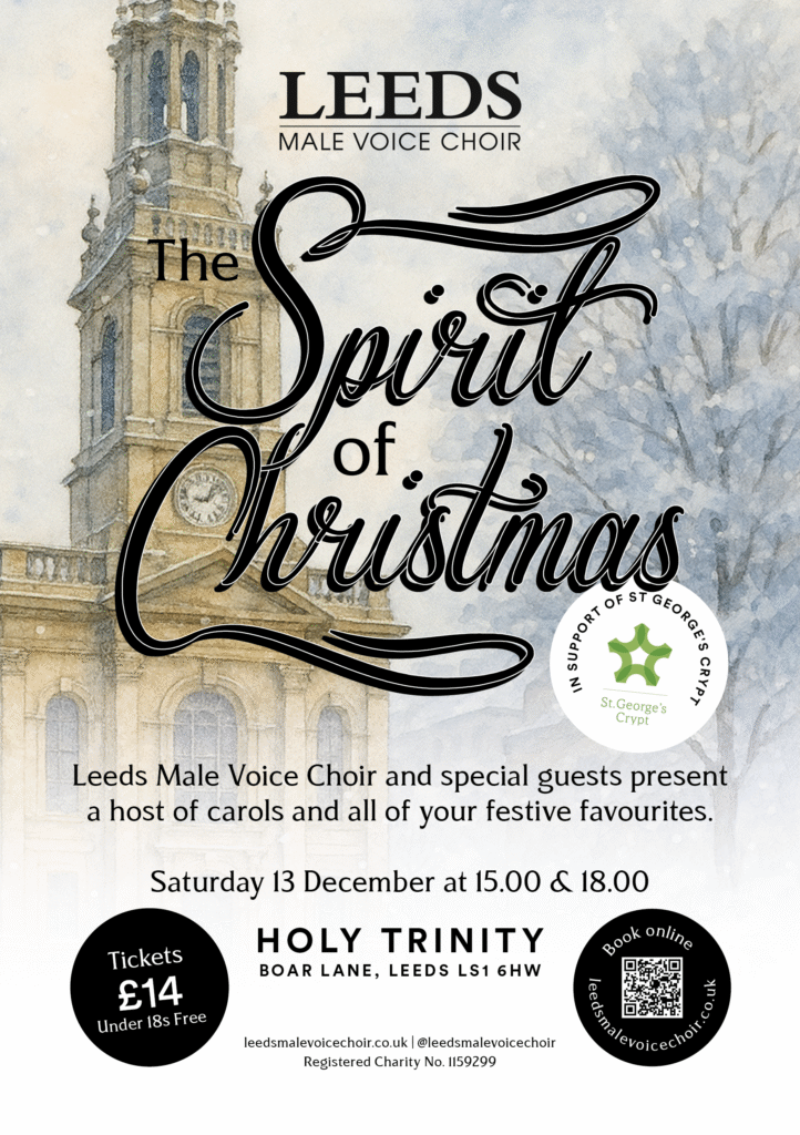 The choir’s annual Christmas celebration takes place in the intimate setting of Holy Trinity Church in the heart of Leeds in support of St George’s Crypt.